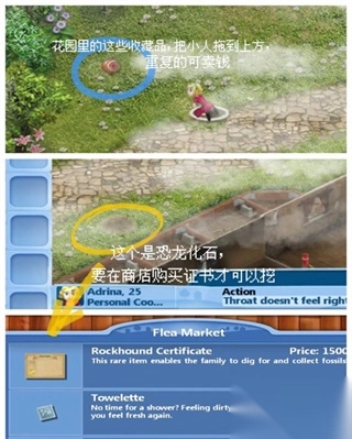 花园里经常会出现一些瓶盖、树叶之类的这些是收藏品,把小人拖到上面去收集。一个土坑里面是化石,要在商店买了证书才可以挖。