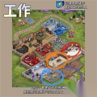 4、接下来就能把小人拖去工作啦,工作地点通常有三个,将小人逐个拖过去尝试一下。若显示“workingoncareer”,那就表示操作正确,此时可以点击左上角绿色的小手,对小人进行鼓励。如此一来,他就会更愿意从事该行为。(红色代表惩罚,一般在生小孩后,小孩在床上蹦跳、乱涂乱画时使用。)
