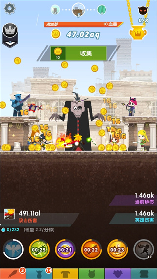 1、点击即可进行攻击、杀戮、收集金币以及雇用英雄等操作。
