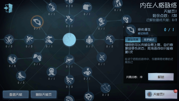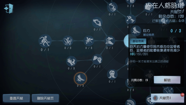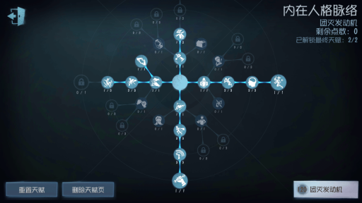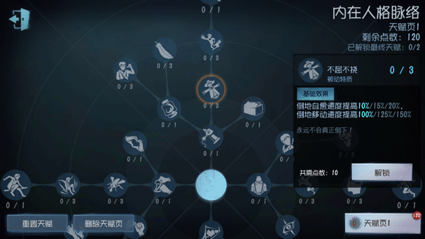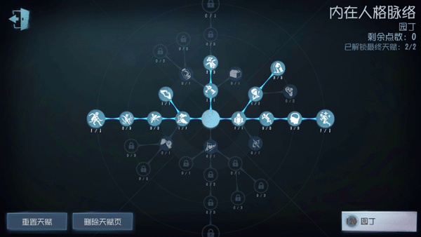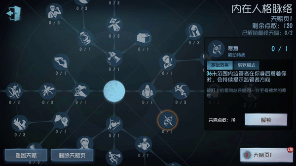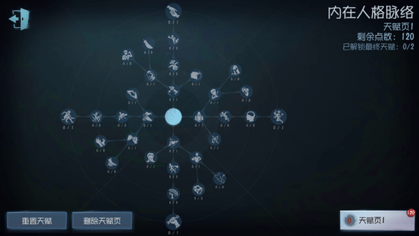 第五人格的天赋由四个大型天赋(也就是四个极端方向)以及诸多零散的各类小天赋构成。每位玩家的天赋点上限为120点,需从0开始逐步积累,好在前几天官方发布更新公告,称会加快天赋点的积攒速度,对新手很友好。每点一个天赋需要消耗5个天赋点,而且每个天赋都必须先将前一个天赋点满(部分天赋要点三次),之后才能点下一个天赋。