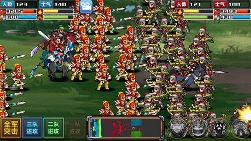 2、游戏中的基础战斗是军队冲锋攻击的模式,我们可以将自己的军队排列成三队,然后可以控制阵型和冲锋时机,通过合理的士兵兵种搭配和冲锋阵型,来最大程度的快速消灭敌人。