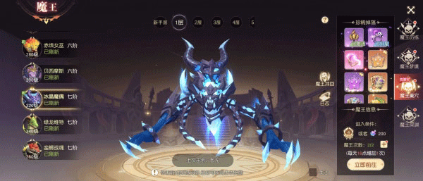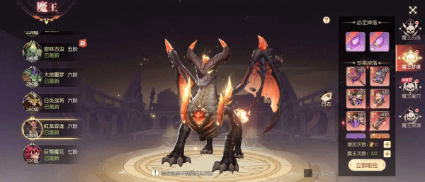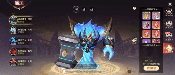 可借助魔王凭证 - 巢穴补充次数,魔王等级越高,掉落奖励越优。