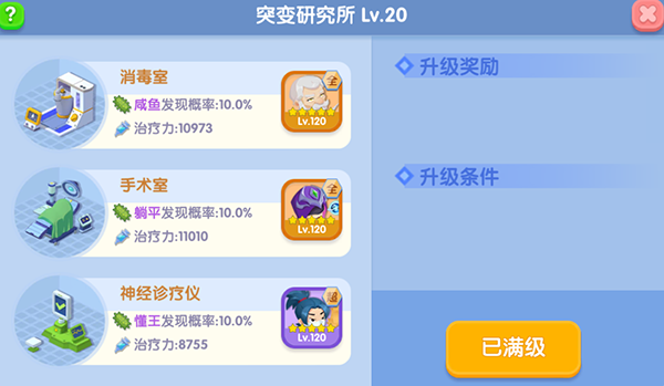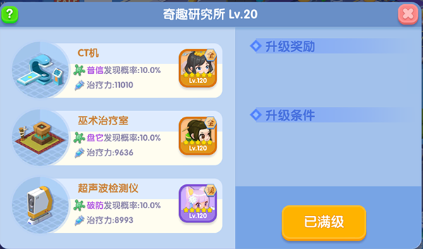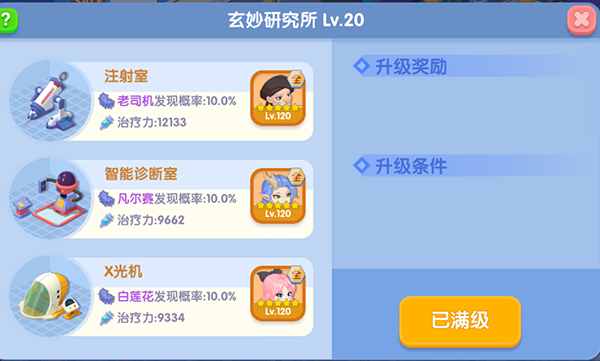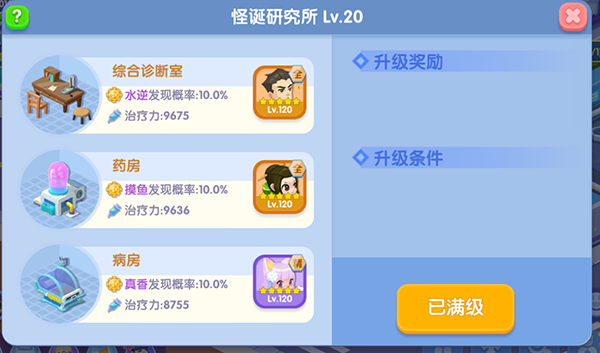 当院长大人等级达到45级,便能开发新地块,打造一座豪华的研究院。研究院内设有16种罕见病症供院长研究。院长可以借助研讨会以及其他方式,获取研究所的升级材料。随着研究所的升级,发现罕见病症的概率也会随之提高。成功治愈患有罕见病的病人,院长还能获得额外收益。(值得注意的是,这些罕见病症会出现在主院的常规病人之中。)