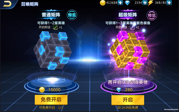 英雄召唤分为两个方式,一是花费钻石从召唤矩阵中获得。召唤矩阵中有游戏里的全部英雄,普通矩阵每天都有3次免费抽奖的机会,超级矩阵每隔48小时就有一次免费抽奖的机会,第十次必定会抽取到英雄。