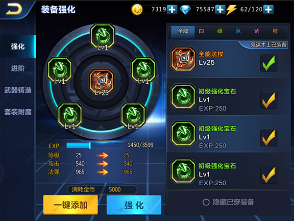 强化石分为初级强化石,中级强化石和高级强化石,不同等级的强化石提供的经验不同,适用于所有装备。