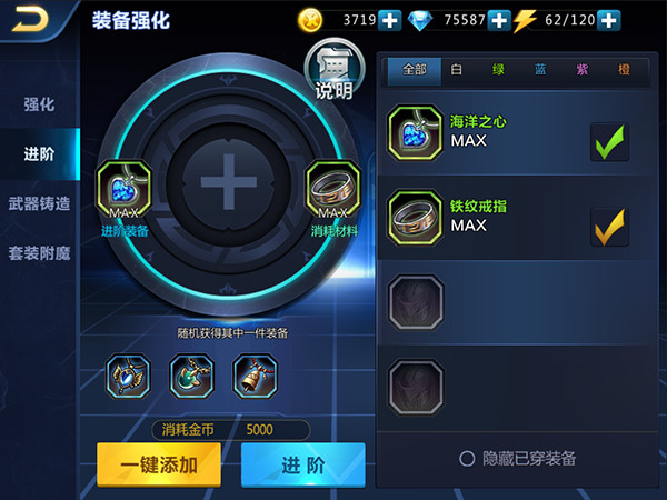 装备按照白绿蓝紫橙的顺序进阶,无法越阶。进阶的结果是随机出现的,只有部位和进阶装备相同。
