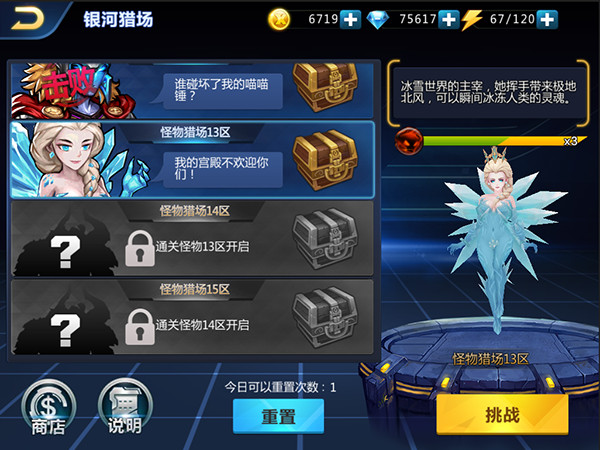当下,银河猎场总共设有15层,每层均囚禁着一名实力强劲的BOSS。玩家需从第一层起依次进行挑战,若挑战成功,便能获取英雄魂石、猎场币、装备以及随机道具。