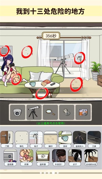 1. 每个画面皆暗藏令人细思极恐的诡异点,且各个场景中的诡异之处不尽相同,玩家可依照提示展开游戏。