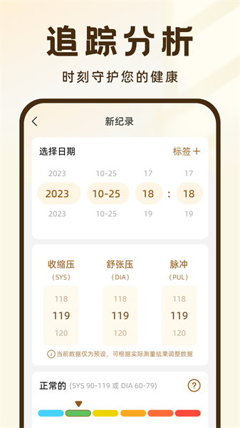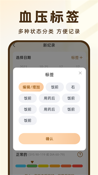 支持用户在每次测量时添加自定义标签,使血压记录更为细致、有序,方便后续的分析与回顾。
