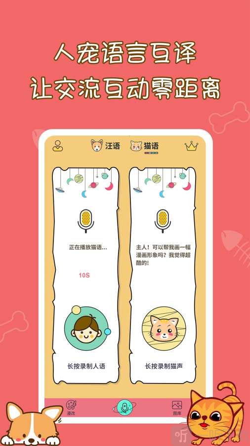 》软件亮点:1. 您是不是还在担心猫和狗不愿靠近您?现在就能把您的声音转换成猫语和狗语,轻松吸引猫和狗的注意。