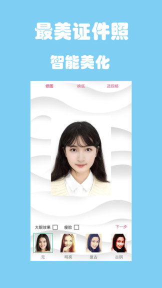 1. 借助智能化功能美化照片,尤其针对面部进行处理,实现大眼睛效果,还配备可调节滤镜。你只需选择合适的位置,就能拍摄出最美的证件照。