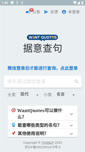 Wantquotes是一款功能强大且操作便捷的文字查询软件,它整合了多种查询功能,提供了丰富的选项。无论是名人名言、经典诗句、著名文学作品,还是流行歌曲歌词,都能轻松查到相关内容。同时,它还具备多种查询方式,如关键词搜索、按作者筛选、按类别浏览等。感兴趣的小伙伴,快来体验一番吧。
