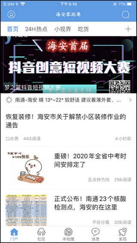 2、海安零距离会实时推送24小时内的本地热点新闻资讯,让您不用出门,就能知晓本地的大事小情。