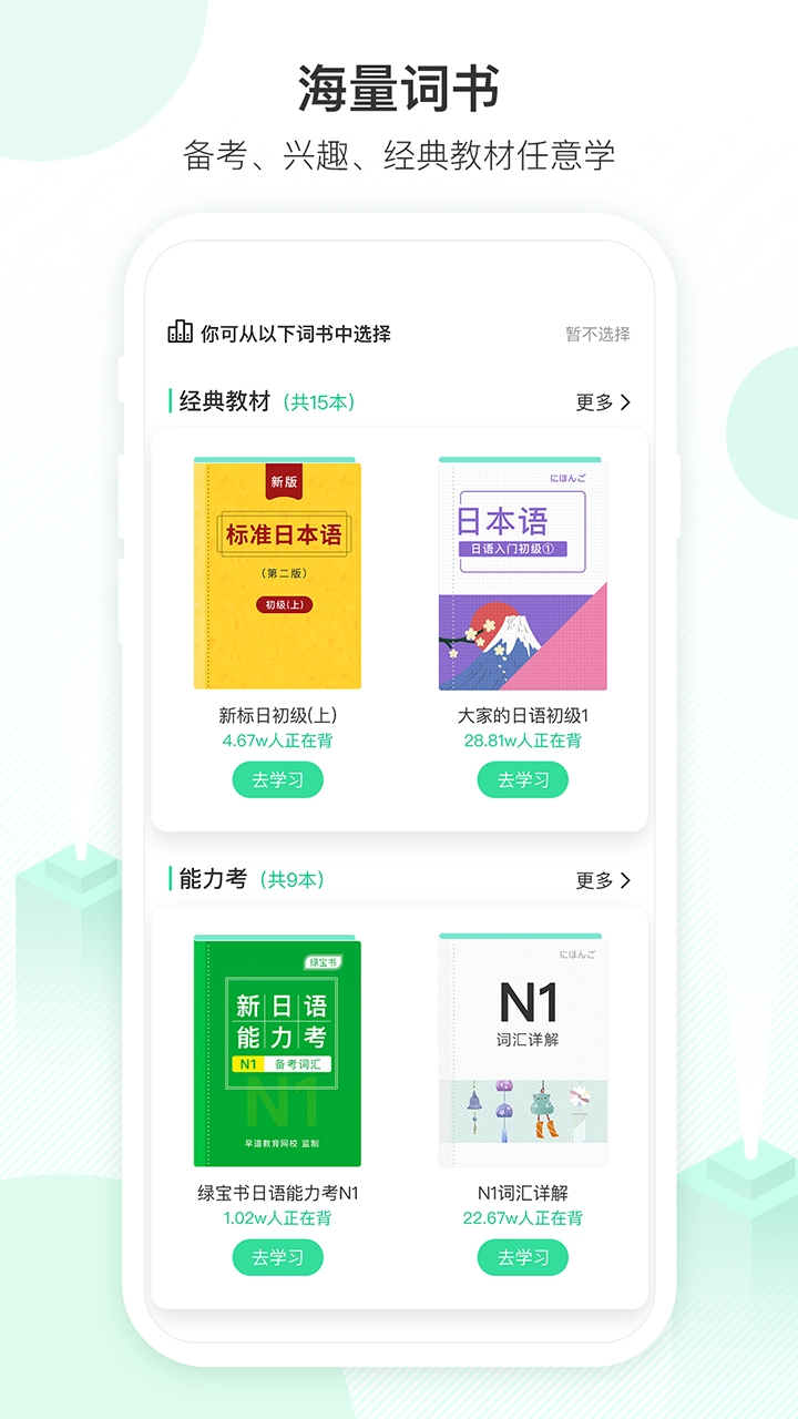 词书丰富,覆盖经典教材(新标准日本语、大家的日语...)、能力考(N5-N1、绿宝书...)、生活兴趣等多方面词书,满足你的各阶段日语学习需求