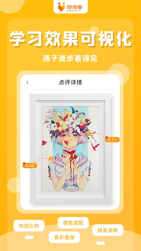 VIP陪画在线儿童学画画有效解决了一系列问题,比如老师在课堂上难以兼顾每个孩子、缺乏优秀老师指导、家长没时间接送,以及没有针对性课程等。其完善的在线少儿美术服务体系,全程陪伴孩子成长的每一步。多元化创新的在线少儿美术课程体系,为每一位孩子量身定制专属课程。此外,VIP陪画在线少儿美术精心甄选5A好老师,让每一个热爱画画的孩子足不出户,就能跟着好老师学画画。