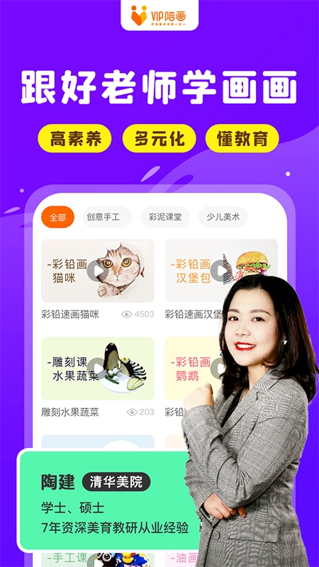 VIP陪画在线少儿美术是专注于3-18岁青少儿的在线美术教育,以“培养未来世界艺术小公民”为使命。在线儿童画画学美术网课中VIP陪画采用“互联网+在线美术教育”模式,融合大数据分析等创新科技,自主研发课程。以“少儿美术教育”为核心,同时推出了国画、油画、素描、速写、色彩、设计等少儿素质课程,致力于帮助孩子提升综合素养。