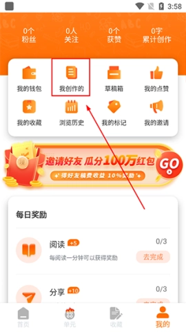 2、在【我的】页面,点击【我创作的】选项;